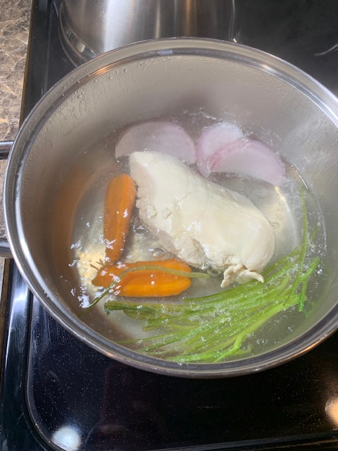 If grilling isn't your cup of tea, you can poach chicken or turkey breast in lightly seasoned broth with leftover veggies and light herbs. Here I've used leftover parsley stems, onion, and a halved carrot. Use low to medium heat to bring water to a low simmer and poach meat for about 20 minutes until internal temperature of 165 F (or 74 C) and tender. Drain under a bowl to reserve the liquid for future stock.