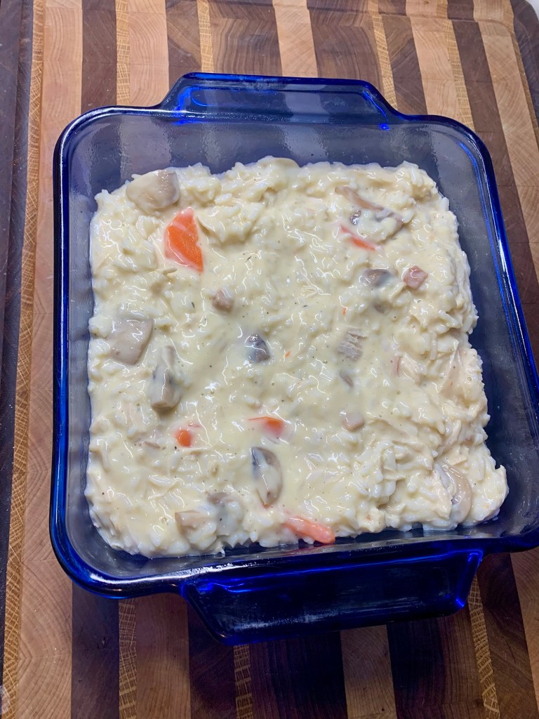 Chicken Casserole is ready for the oven, just cover it and bake.