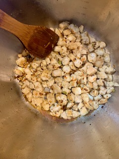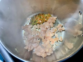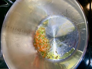 - Prepare the Veg: Use a stock pot with a heavy bottom and lid. On medium low heat, add butter and oil to the pot. When butter melts add veggies and cook until onions are translucent.